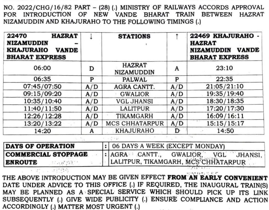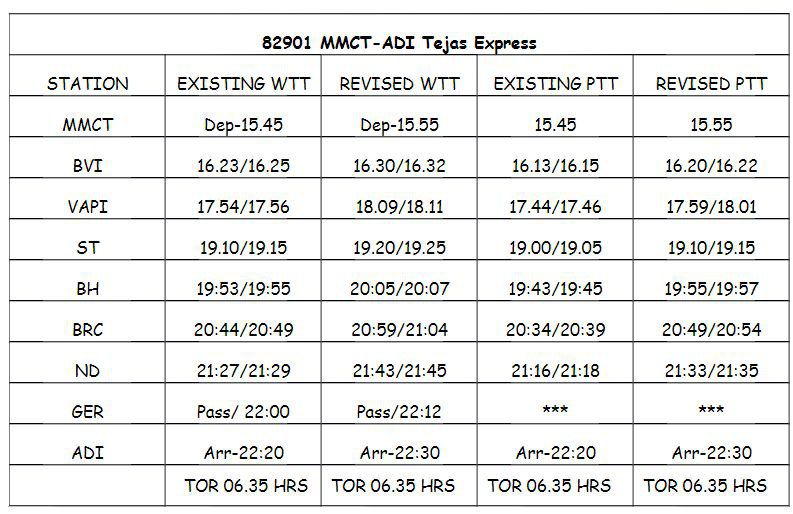 82901 तेजस एक्सप्रेस की समयसारणी 10 मिनीट देरी से की गई है।22961 वन्देभारत एक्सप्रेस की समयसारणी 10 मिनीट नियमित समयसारणी से पहले की गई है।
