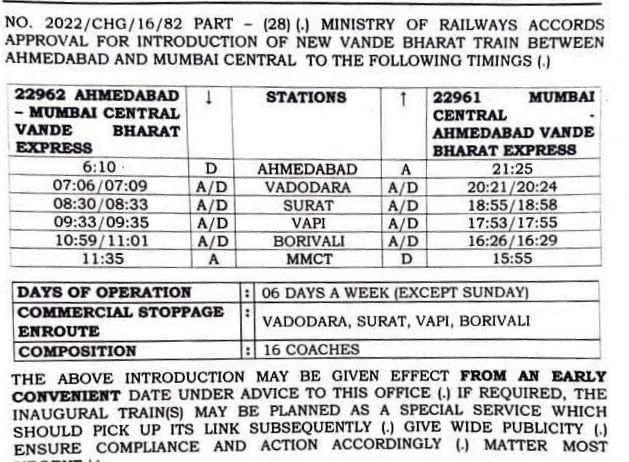 1: अहमदाबाद – मुम्बई सेंट्रल वन्देभारत