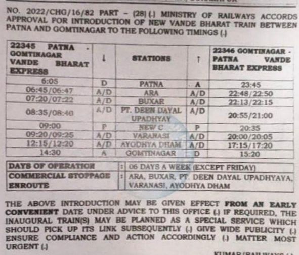 9: 22345/46 पटना गोमतीनगर पटना वन्देभारत (सप्ताह में छह दिवसीय)